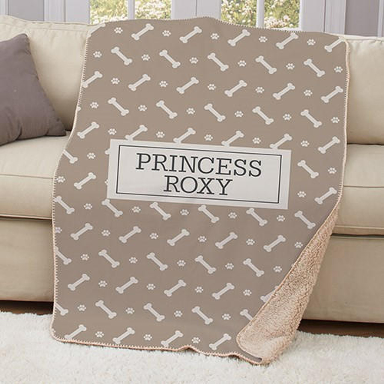 This Personalized Dog Bone Sherpa Blanket will be your new favorite blanket to snuggle up next with your four legged friend.