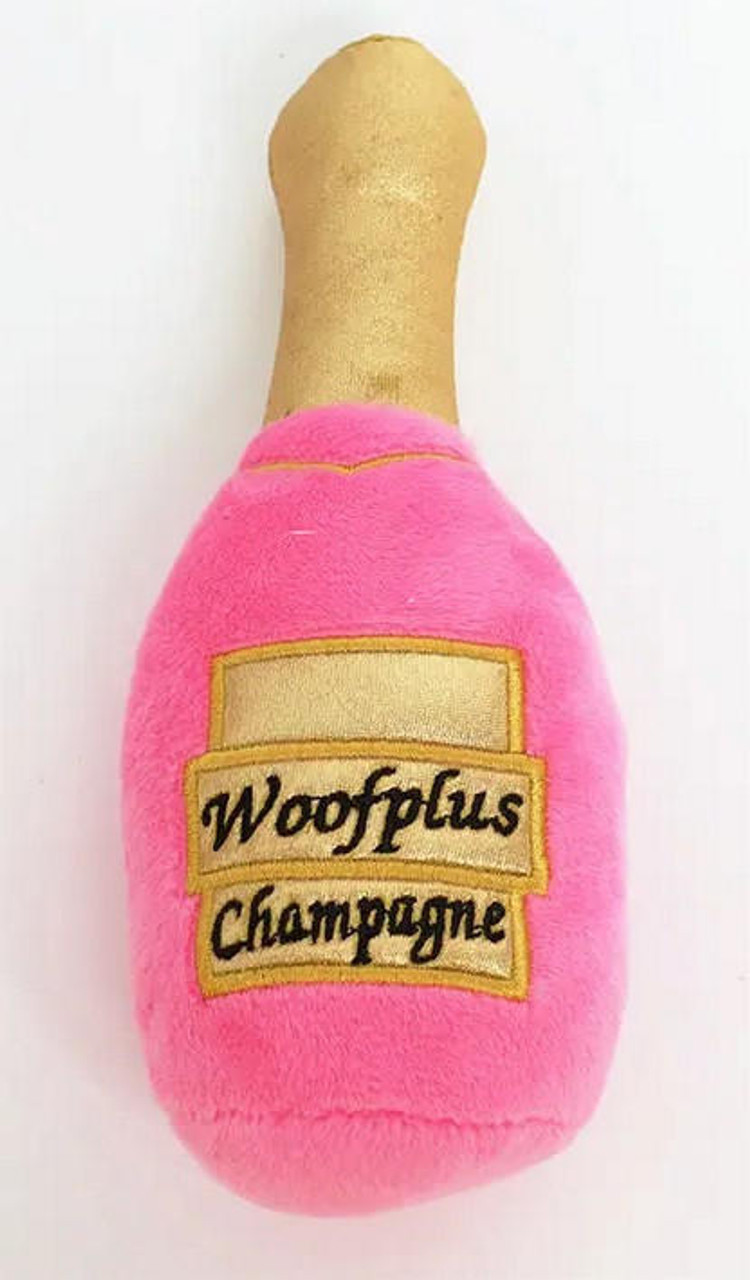 7″ Hot pink plush toy with gold top and label. Embroidered.